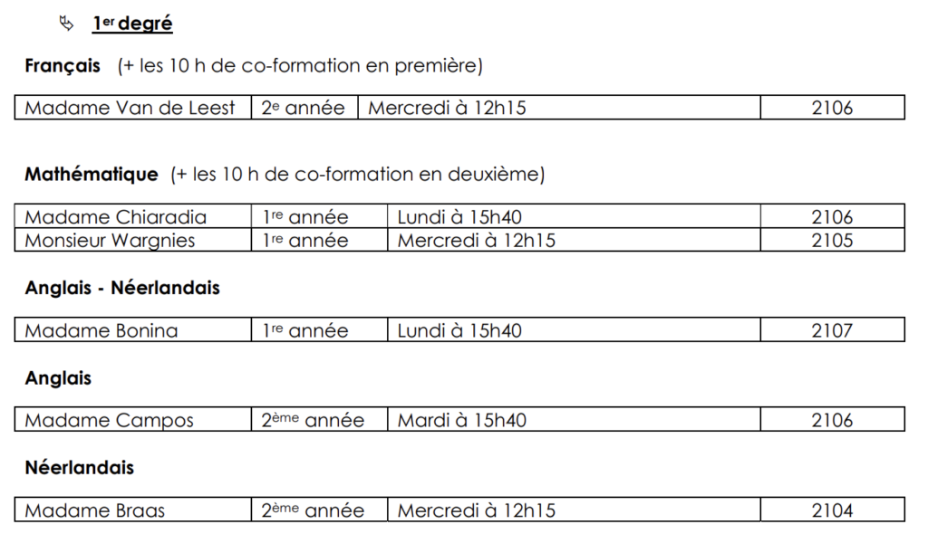 Les élèves du premier degré bénéficient, dans le cadre de l’horaire normal, d’une heurede français avec deux professeurs en classe en première et en mathématiques en deuxième (co-formation). Ceci devrait permettre de faire de la remédiation immédiate,d’aider les plus faibles à mieux progresser et de combler les lacunes constatées en cours d’année.
