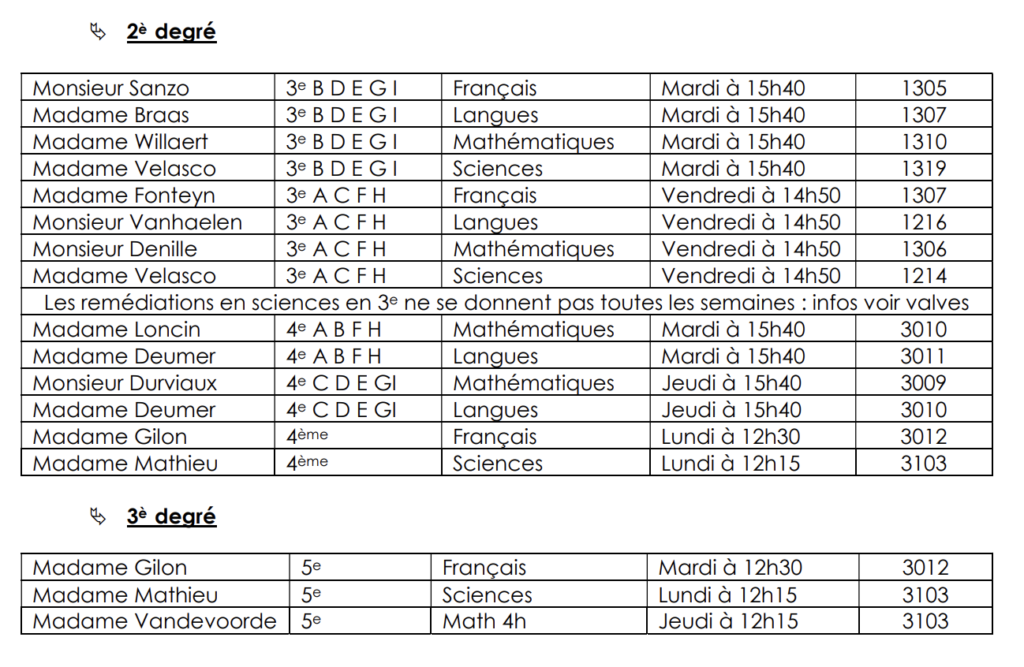 • Au premier degré : le conseil de classe estime nécessaire une remédiation systématique dans une ou deux matières durant une période définie. L’élève est alors invité à se présenter chaque semaine à ces remédiations les présences sont prises.